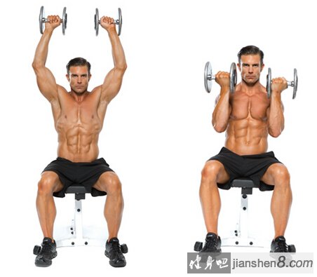 2.推举尽量不要推到双臂完全伸直的最高点,否则肘关节完全伸直被锁住,三角肌就不怎麽用力了,几乎完全靠骨骼支撑重量。如果在肘关节伸直前就停下来,开始下放哑铃,则练习效果会大大加强。